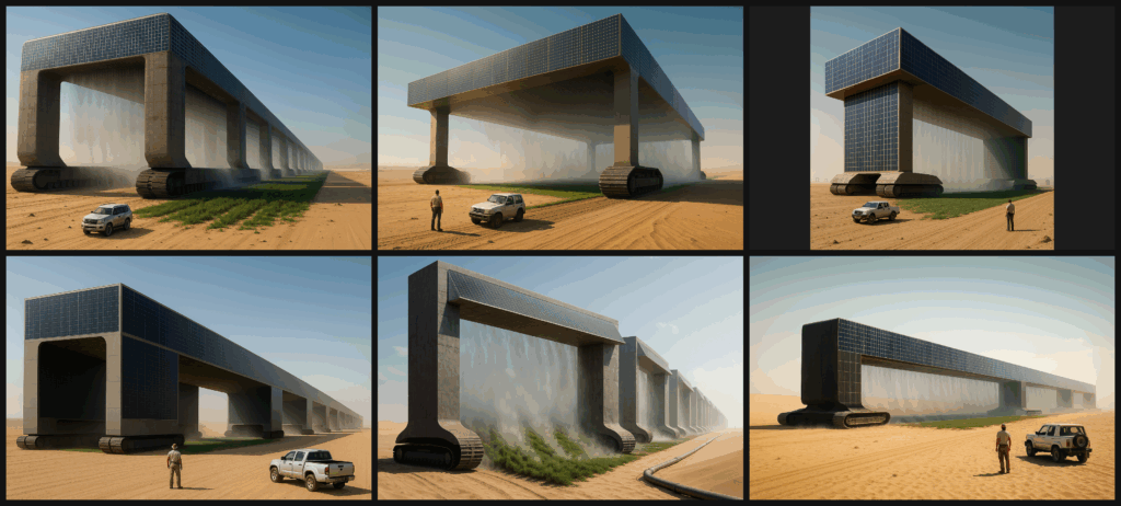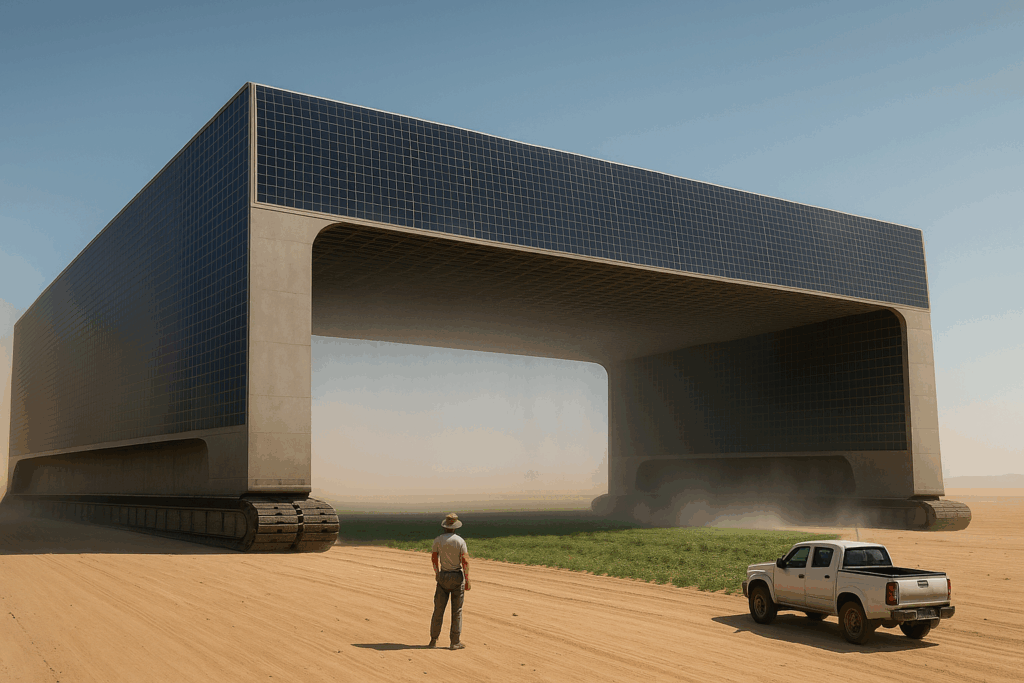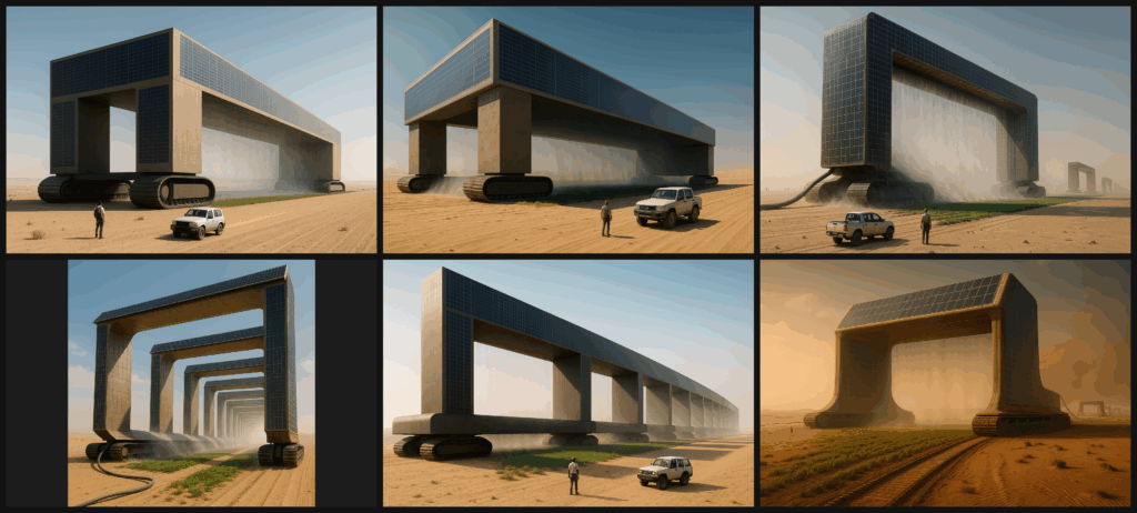 • 発想の核:海から海水のパイプライン×電力による真水化×日陰帯×微細ミスト×超低速自走。前後は開口、上部・側面は太陽光パネルで敷き詰め。左右に超ロングの連続キャタピラ。