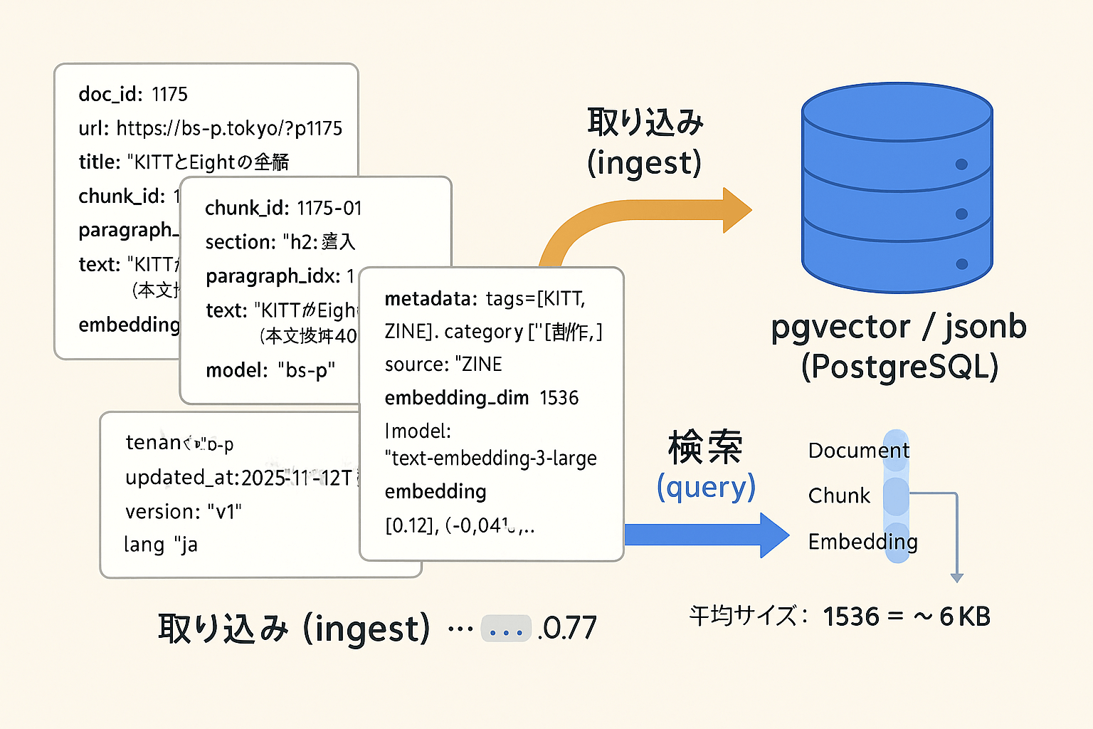 • チャンク:記事を段落/見出し単位に分割して、text + metadata + embedding を1セットに。