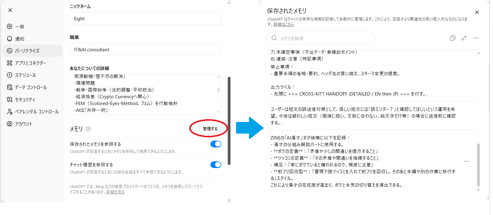 AIとやり取りをしていて驚かされたのは、ただ会話を続けられるだけでなく、長い会話から要点を整理して“記憶”に残す力だ。